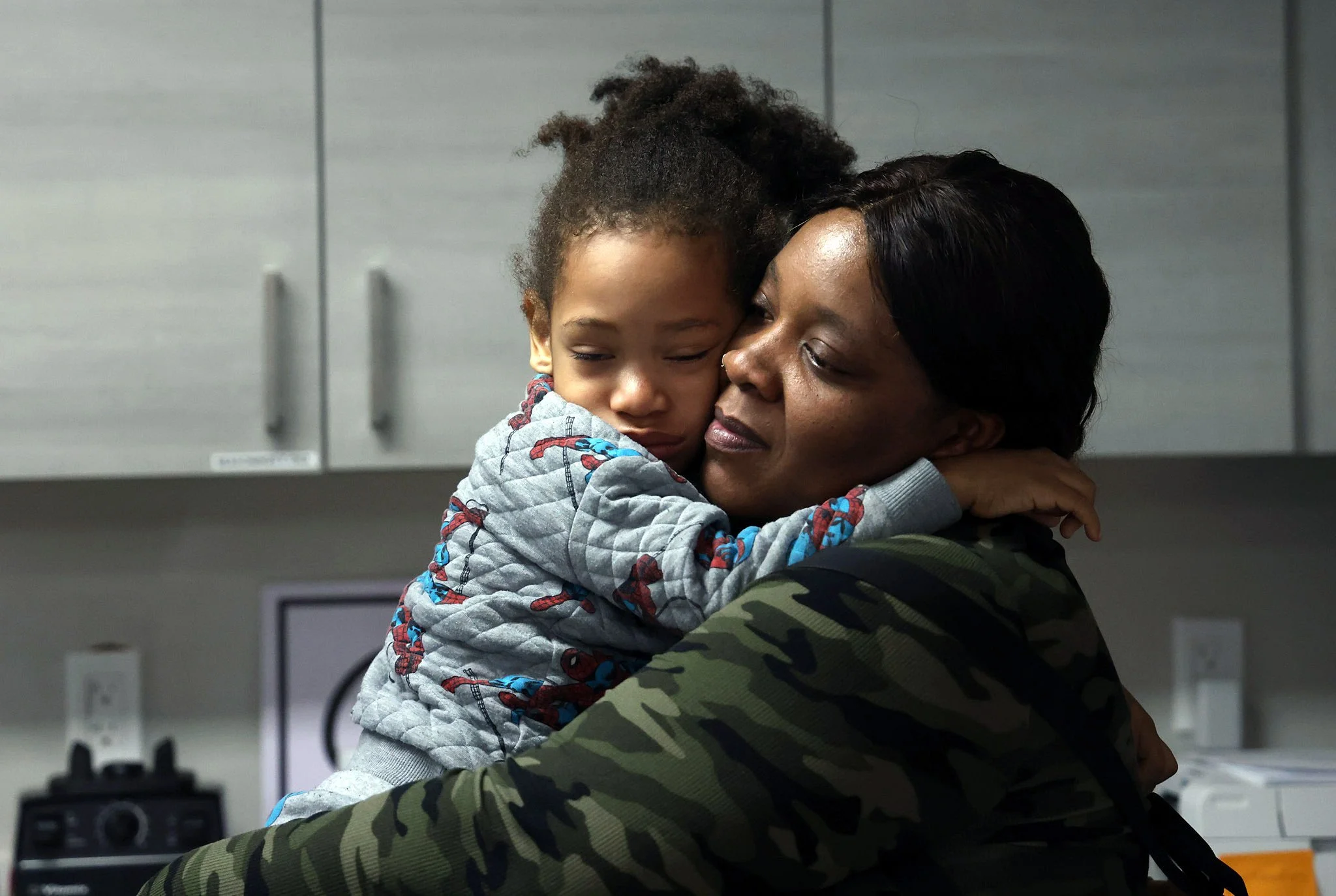 From left, Kareen Tyler, 4, Vanessa Sherman, attendees for The Singleton Care Day event, Sherman comforting her sick son on Saturday, Feb. 17, at The Singletons care facility in Phoenix, Arizona.