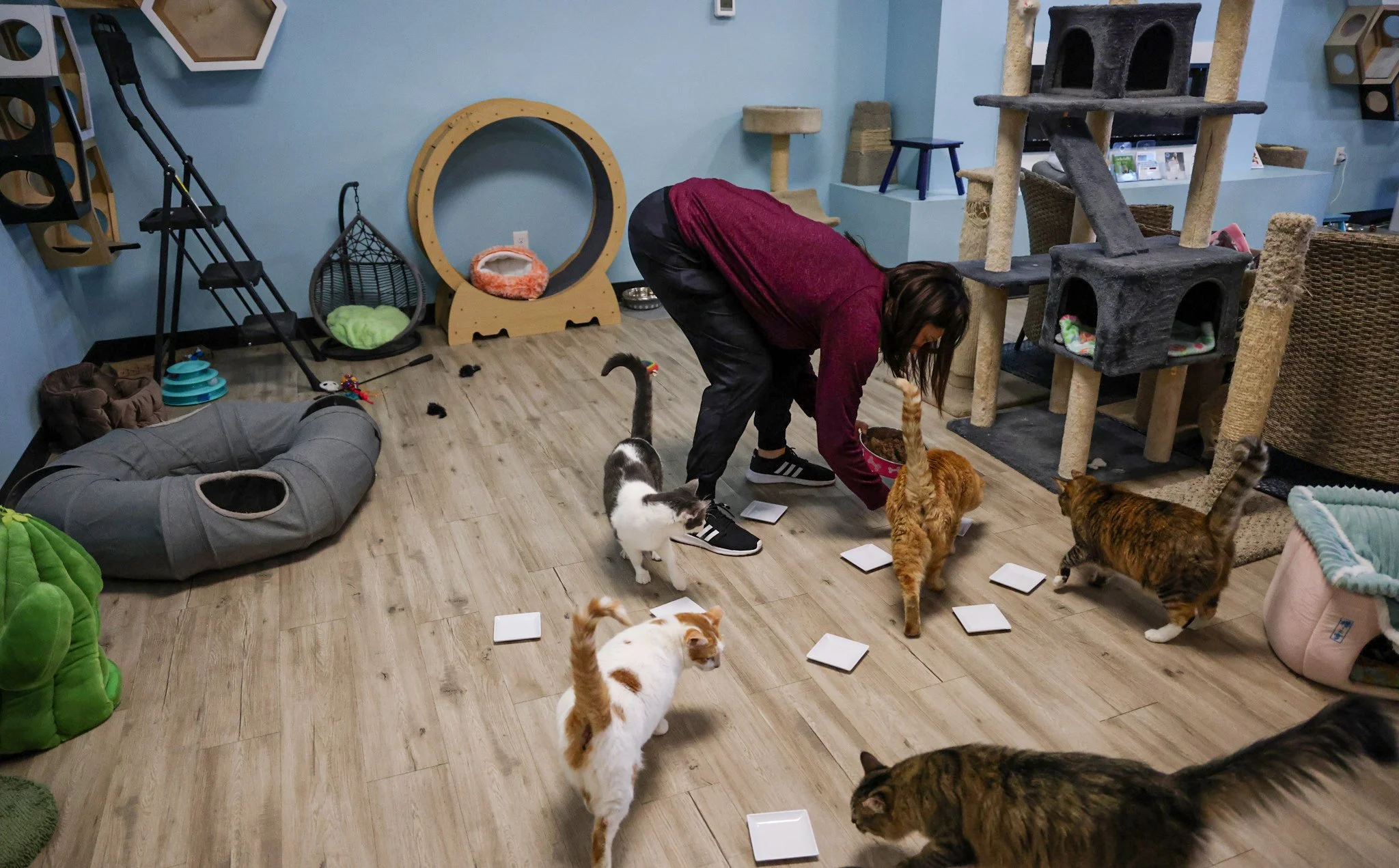 Saving One Life volunteer Kelly Stinson feeds cats at the Kitty Pause Kitty Café in Mesa on Feb. 28, 2024. Kitty Pause Kitty Café partners with Saving One Life on cat adoptions.