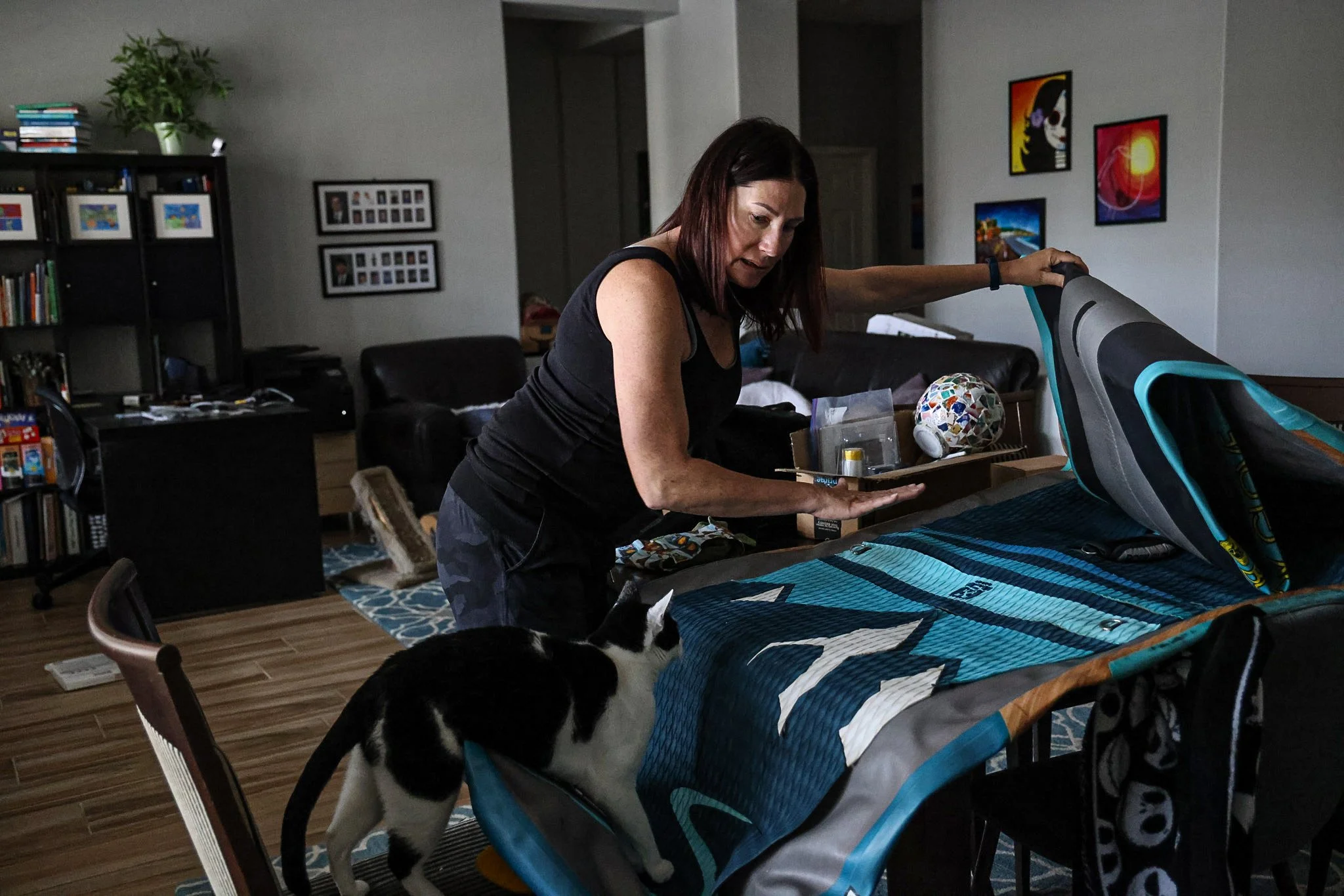Saving One Life volunteer Kelly Stinson strives to gently remove cat off of paddle board in her home on Feb. 28, 2024, in Chandler.