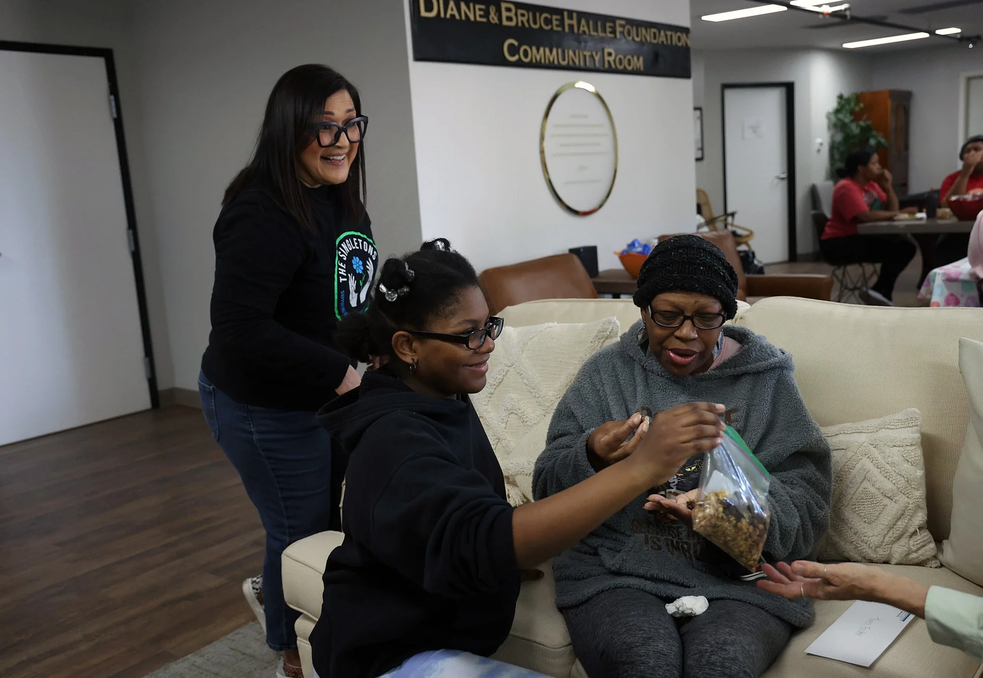 From left, Tily Bowens, Case Management Director, Payton Foster, 10, Thell Foster, attendee of The Singleton Care Day. Thell Foster’s daughter Payton brings snacks for her mother on Saturday, Feb. 17, at The Singletons facility in Phoenix, Arizona.