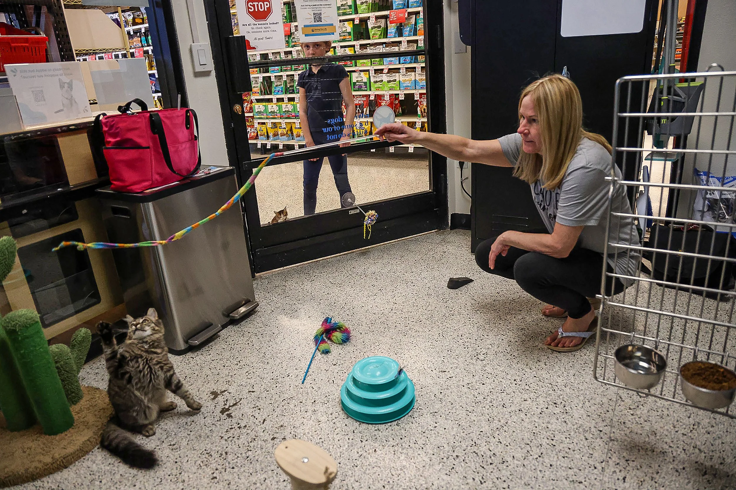 Cathy Christensen, volunteer at Saving One Life, pets cats during her shift at PetSmart on Wednesday, March 20, in Phoenix, Arizona. She has been volunteering for three years.